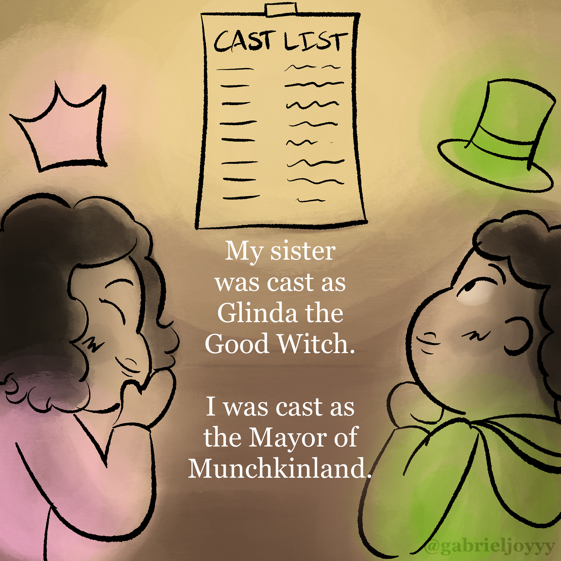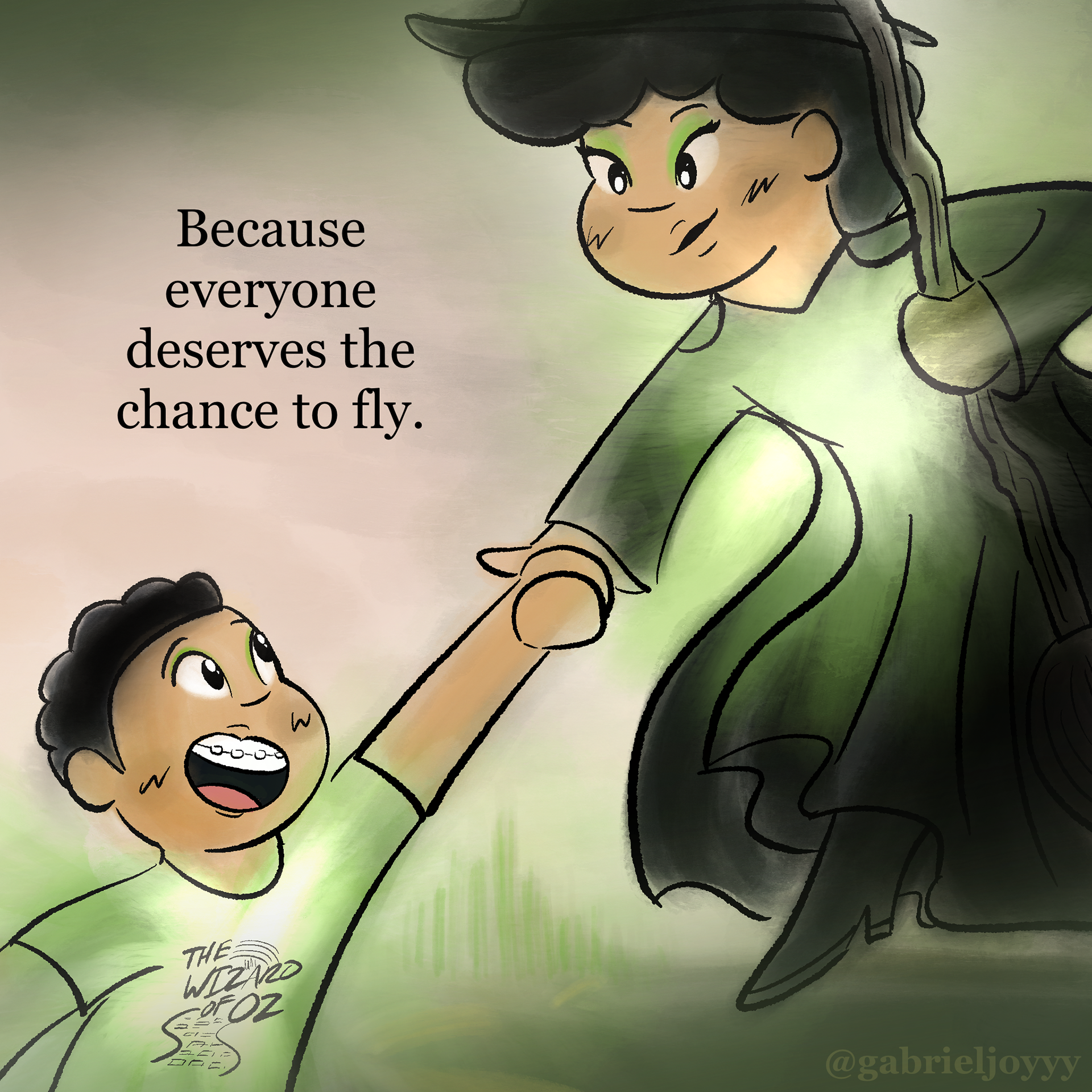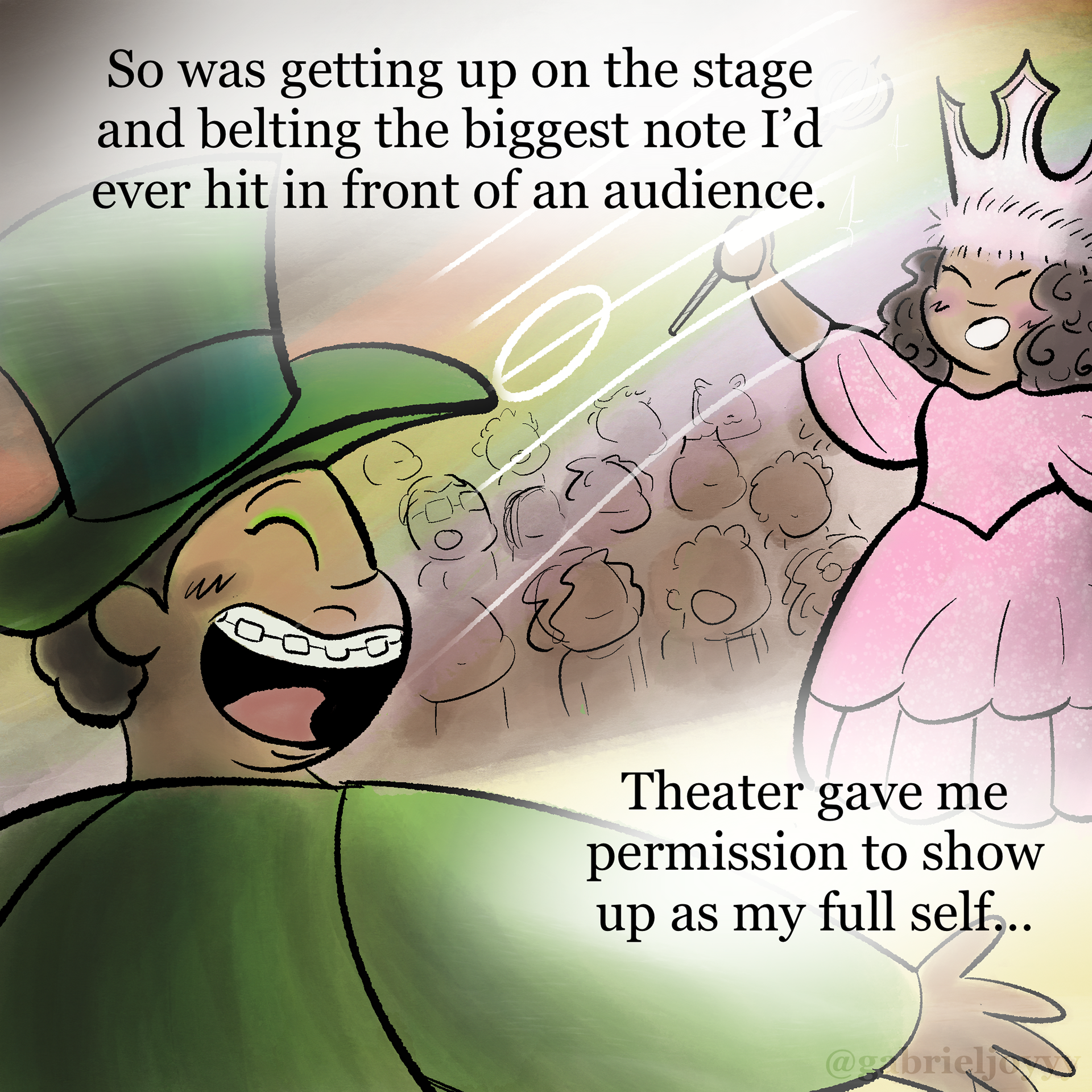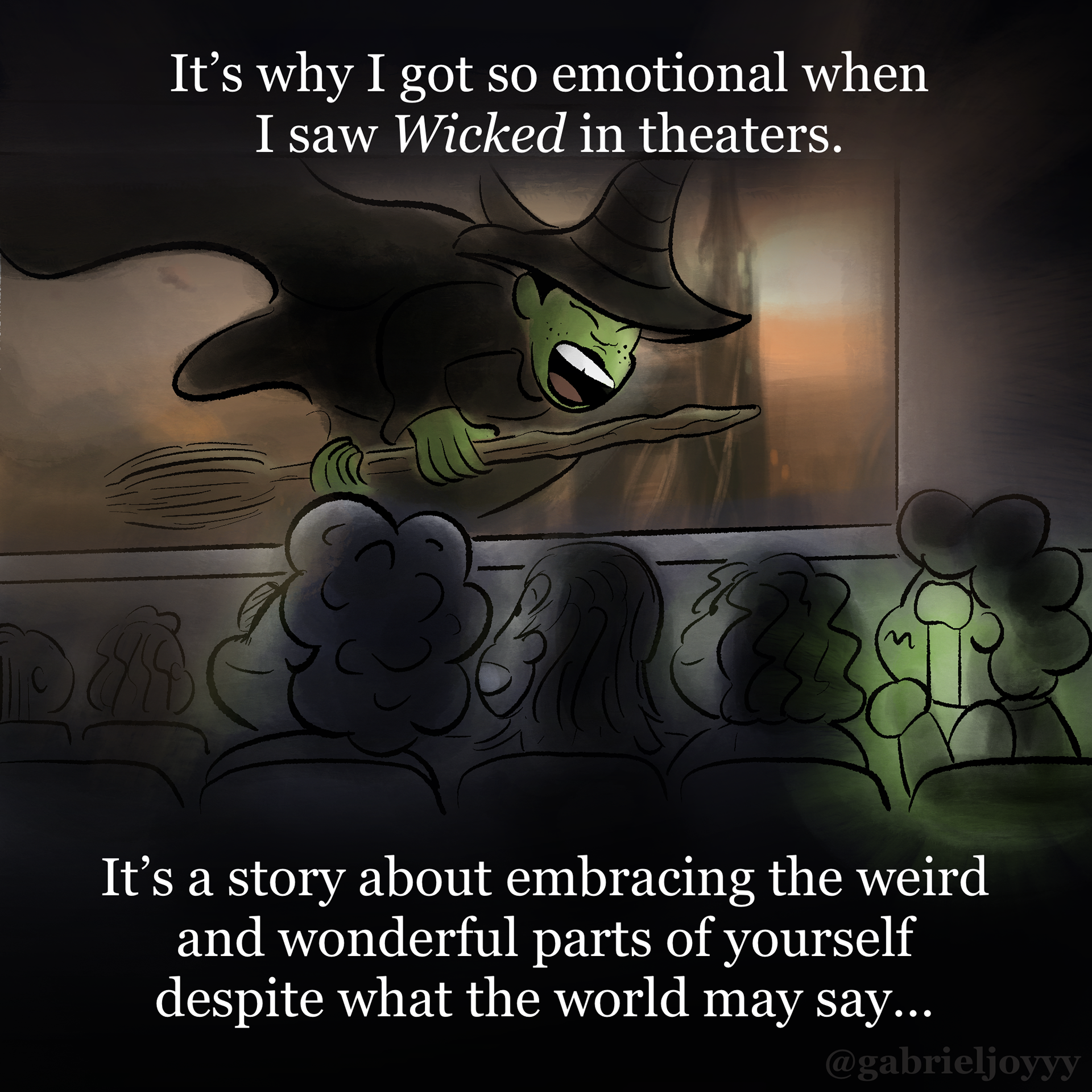 An autobiographical comic about how I found myself through musical theater. Created for Instagram @gabrieljoyyy, celebrating the release of Wicked For Good (2025) in theaters. Based on The Wizard of Oz (1939), Directed by Victor Fleming and Wicked (2024), Directed by Jon M. Chu, and Lyrics by Stephen Schwartz.