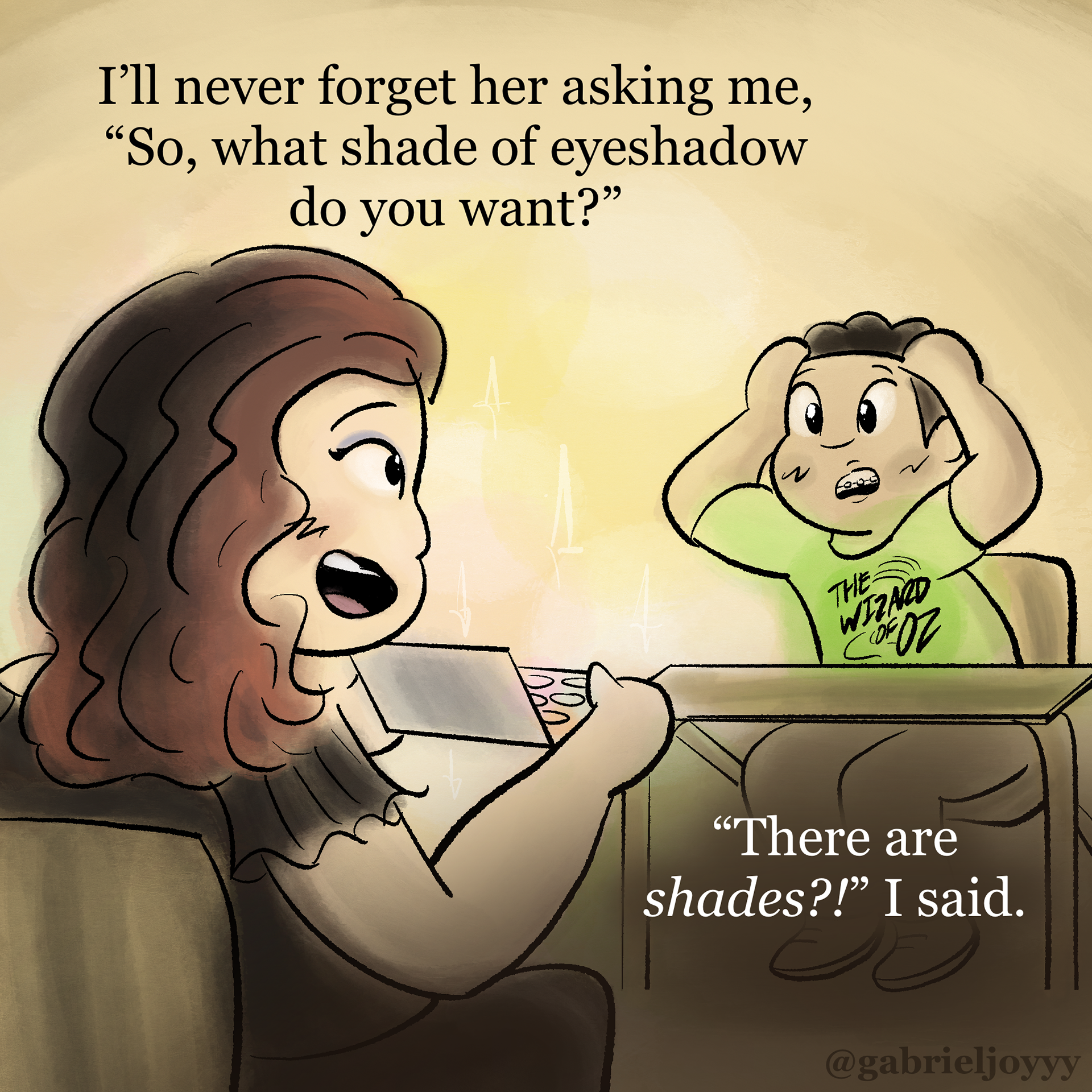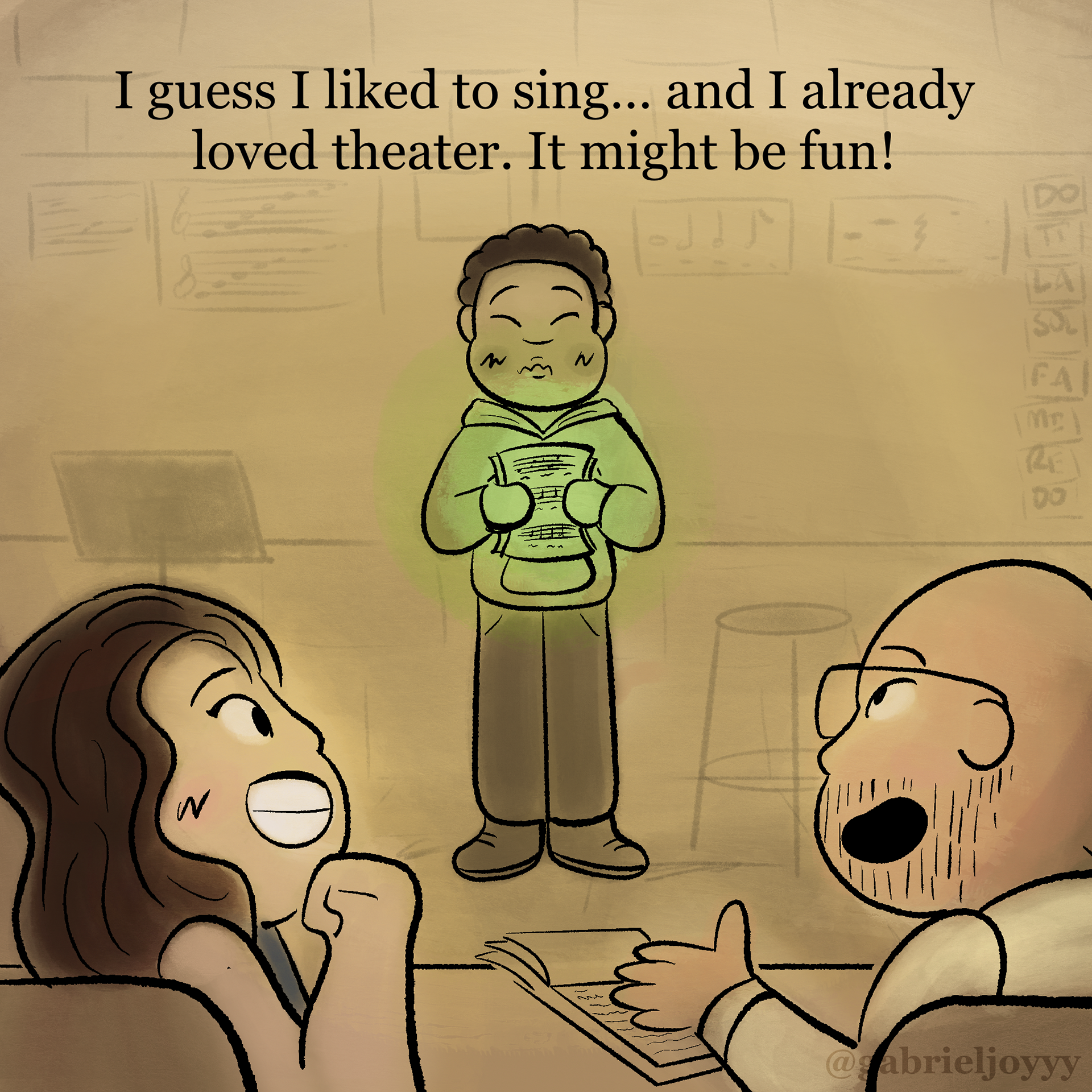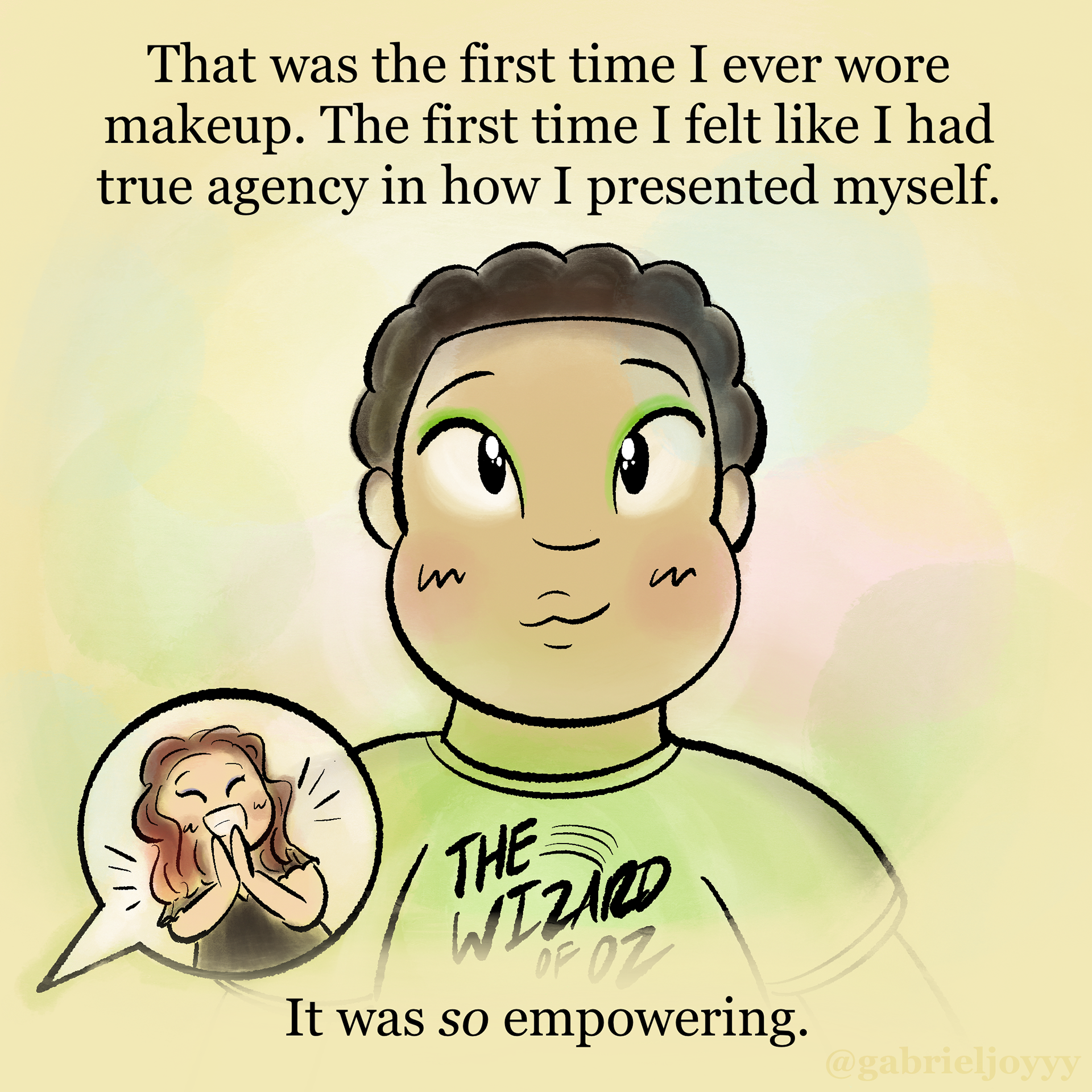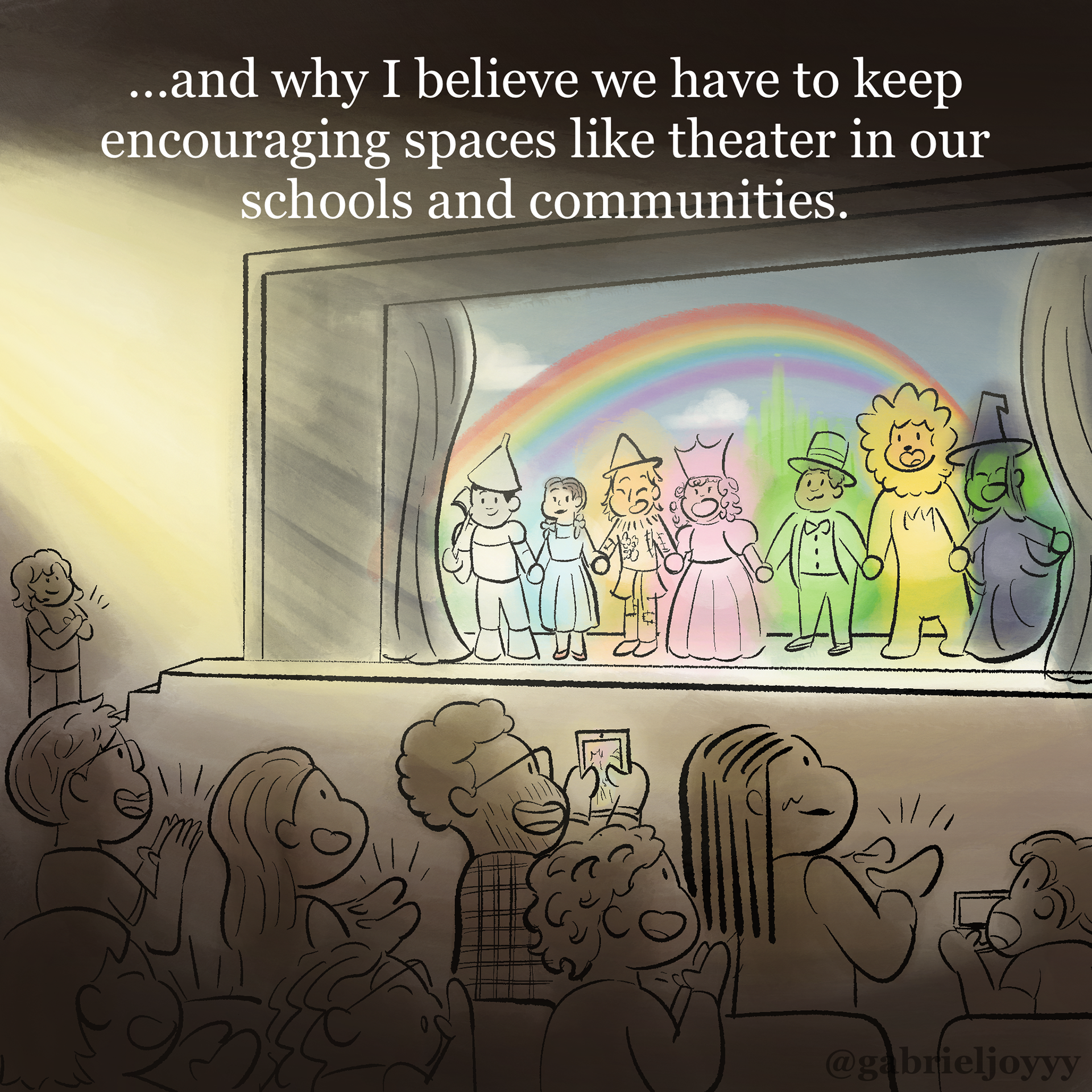 An autobiographical comic about how I found myself through musical theater. Created for Instagram @gabrieljoyyy, celebrating the release of Wicked For Good (2025) in theaters. Based on The Wizard of Oz (1939), Directed by Victor Fleming and Wicked (2024), Directed by Jon M. Chu, and Lyrics by Stephen Schwartz.